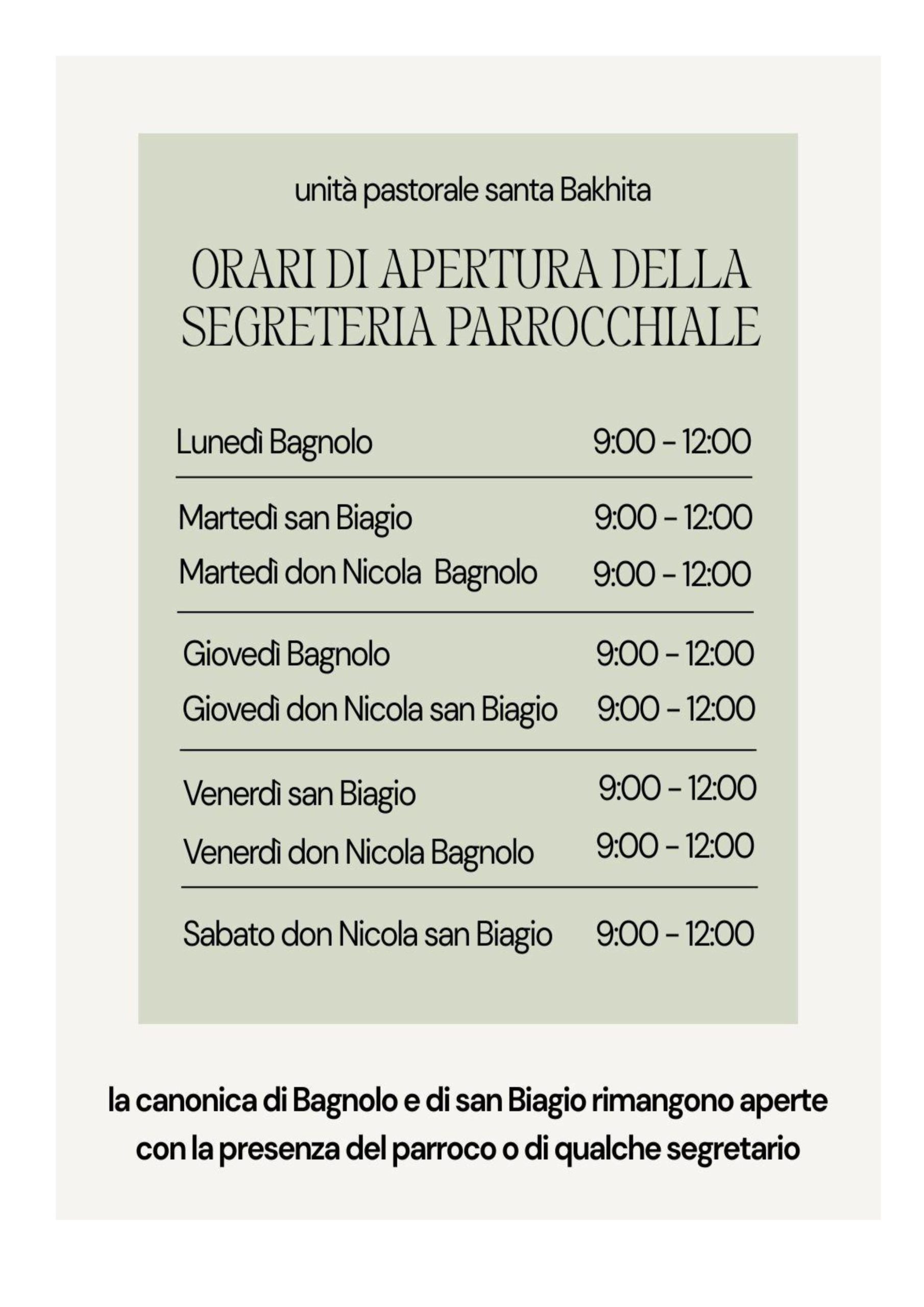 Orari segreteria Parrocchiale